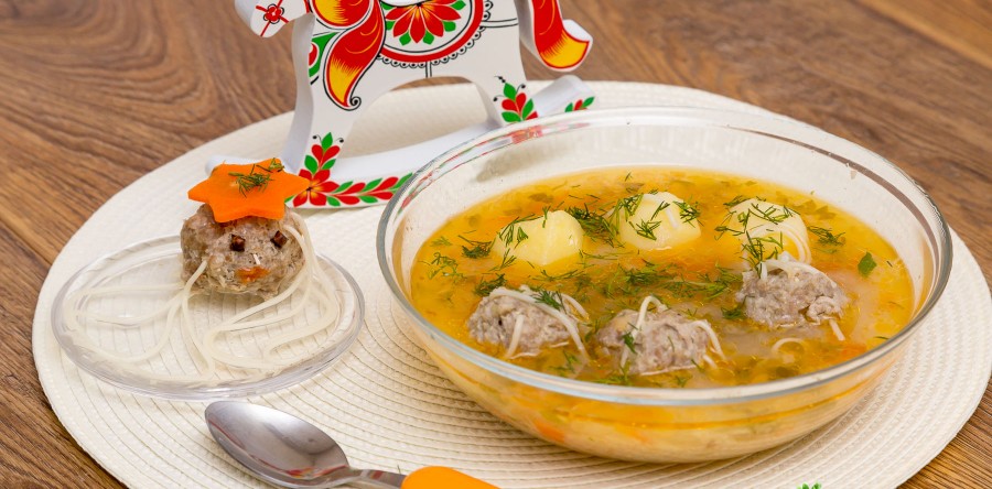 Протертое отварное мясо добавляют в детские овощные супы-пюре с момента введения мясного прикорма. Деткам старше 10 месяцев в супы из овощей можно добавлять немного бульона, а варить их на мясном бульоне советуют с годовалого возраста. Мясо в них для ребенка 2 лет уже может представлять собой небольшие кусочки. Такие блюда часто варят из кролика или из говядины. Также для детей старше 1,5 лет популярны супы с фрикадельками. - Куриные.