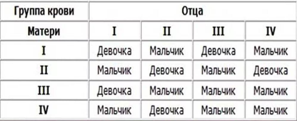 Одним из таких распространенных способ, опять таки является таблица, и теперь она состоит из одной составляющей, это группа крови. Да, зная группу крови матери и отца, можно выяснить, кто у них родится. На мой взгляд, это забавно, но во многих случаях этот метод хорошо работает.