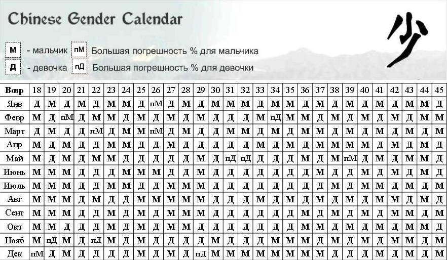 Китайский календарь представляет собой специальную таблицу. В ее вертикальном ряду перечислены месяцы с января по декабрь, а по горизонтали указан возраст женщины, желающей забеременеть мальчиком. На пересечении строк имеются буквенные обозначения М или Д. При совпадении вашего возраста и месяца, в котором вы планируете зачатие, с буквой М и будет наивысшая вероятность того, что зачать удастся именно мальчика. По статистике, в 90% случае китайский метод оказывается достоверным.