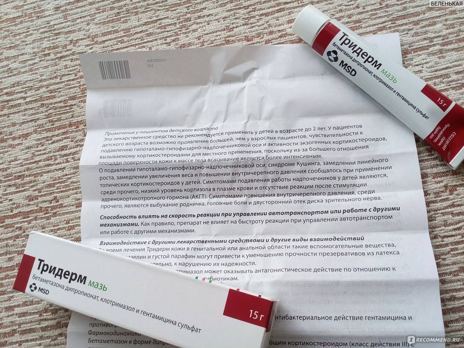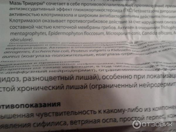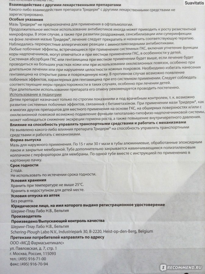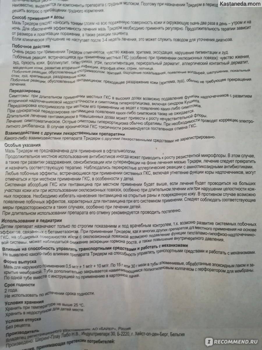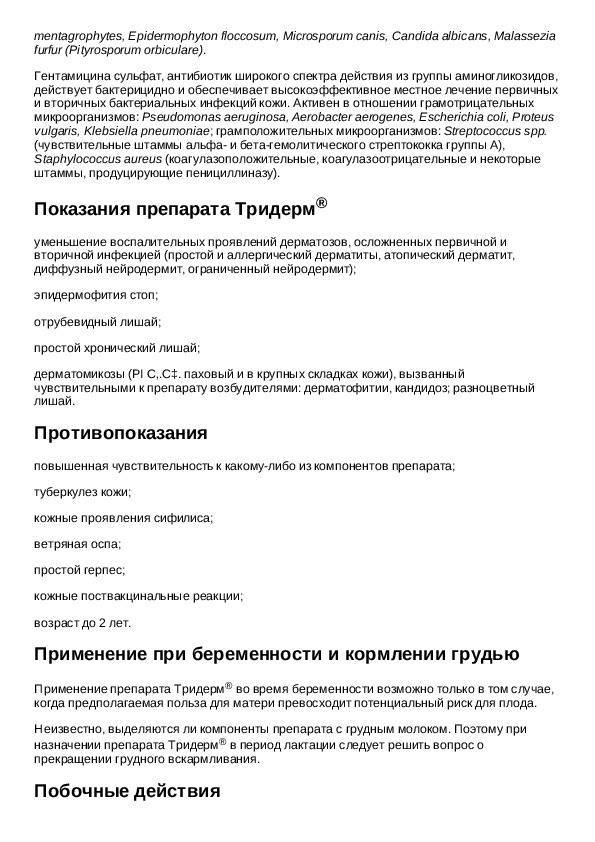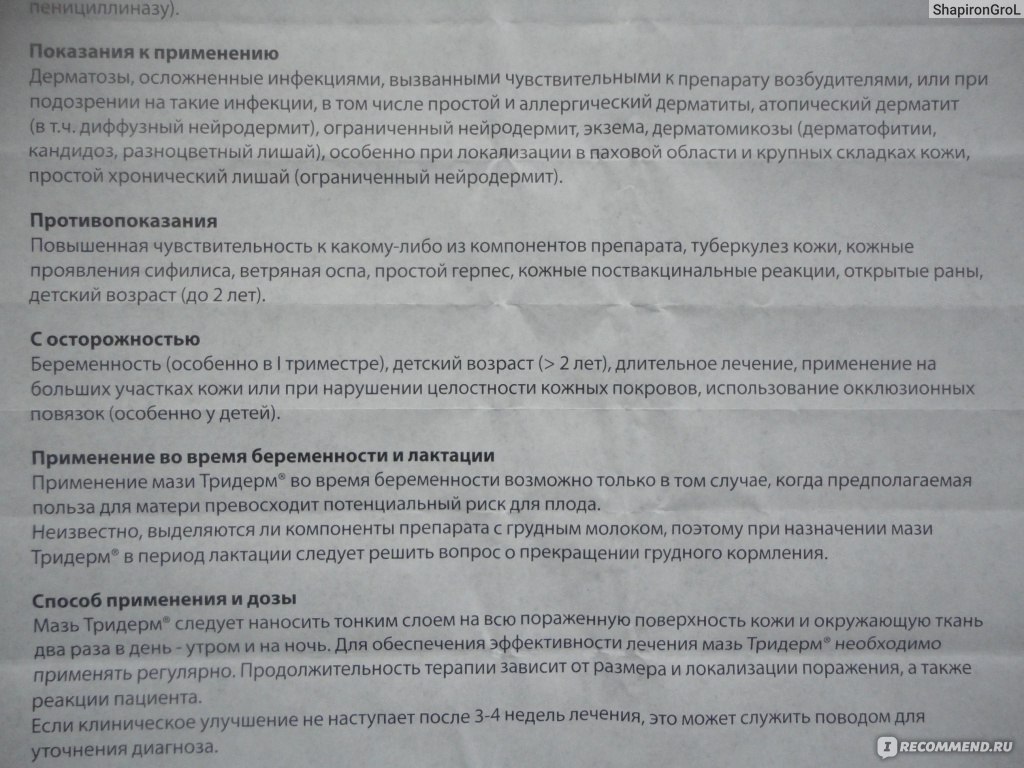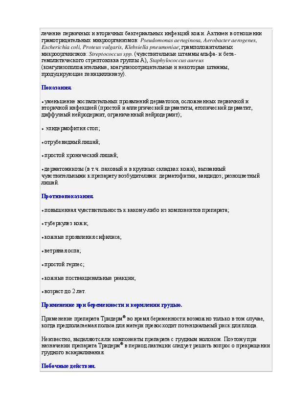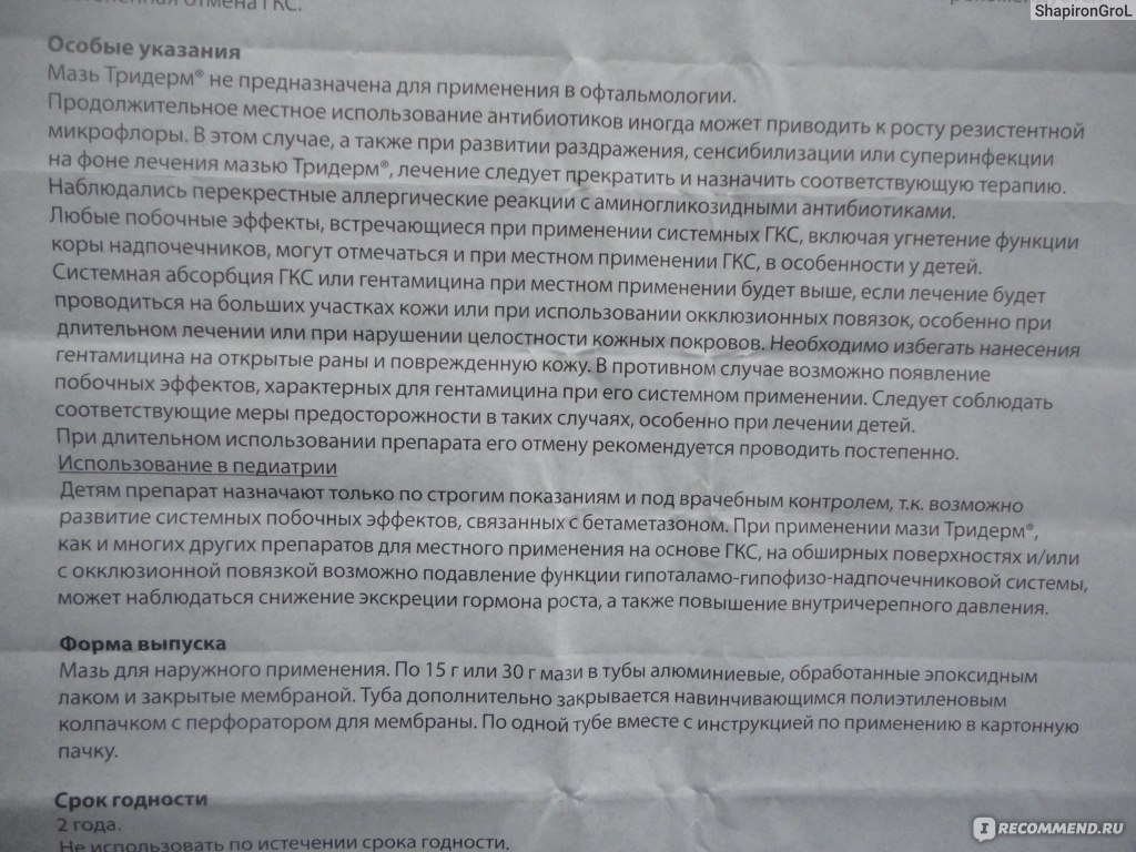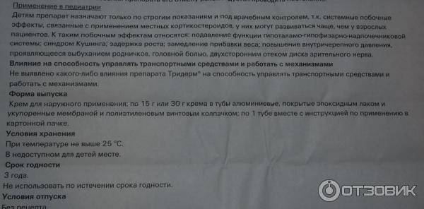Мазь. Детям препарат назначают только по строгим показаниям и под врачебным контролем, т.к. возможно развитие системных побочных эффектов, связанных с бетаметазоном. При применении препарата Тридерм , как и многих других препаратов для местного применения на основе ГКС , на обширных поверхностях и/или с окклюзионной повязкой возможно подавление функции гипоталамо-гипофизарно-надпочечниковой системы, может наблюдаться снижение экскреции гормона роста, а также повышение ВЧД .