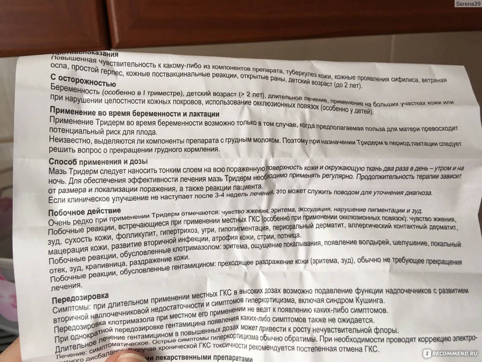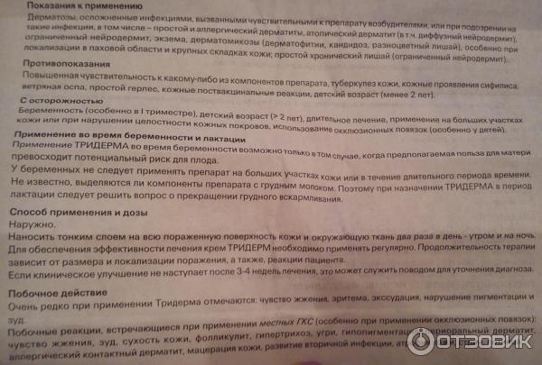 - Тридерм при беременности в 3 триместре, особенно на последних неделях, применять не рекомендуется. При длительном использовании препарат концентрируется в грудном молозиве и может после родов попасть к младенцу во время вскармливания.