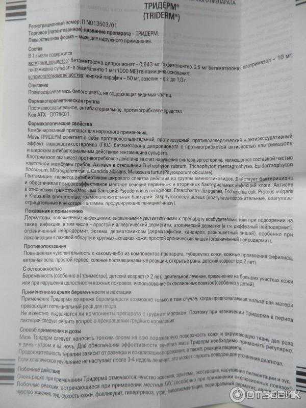 - Относительно того, безопасно ли применять Тридерм при беременности во 2 триместре. То лечение допустимо только в случае крайней необходимости. В процессе лечения разрешается наносить мазь в минимальном количестве на ограниченные участки кожи. Запрещено наносить мазь на молочные железы, лицо, веки.