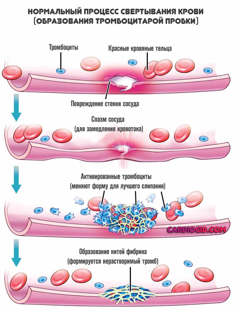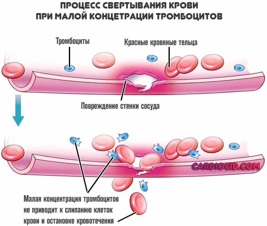 Тромбоциты активируются в сосудистом русле, запускается механизм свертывания крови. Из-за усиленного потребления тромбоцитов красный костный мозг начинает их активно продуцировать, и если причина патологии вовремя не будет устранена, их уровень в крови уменьшится до критической отметки.