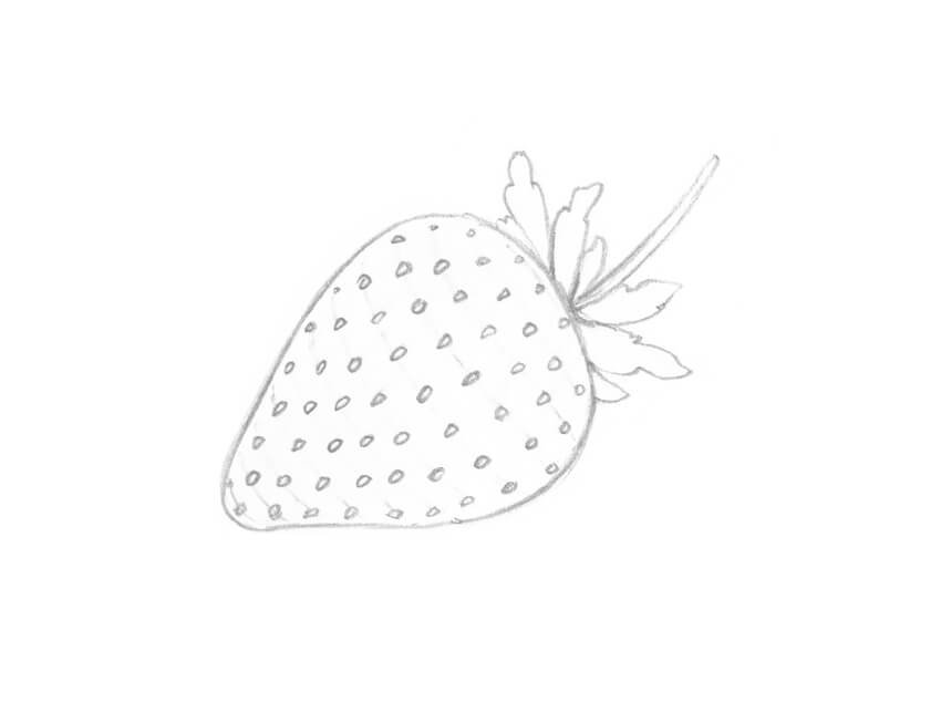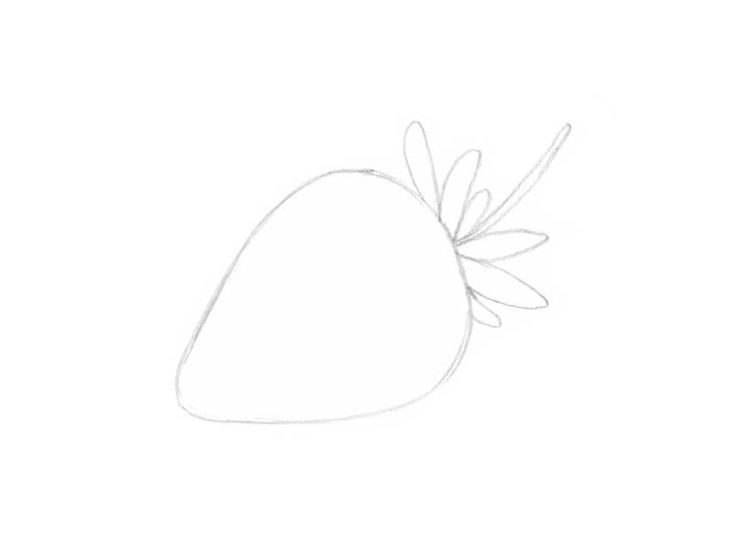 С помощью карандаша HB, нарисуйте примерную форму клубники. Далее добавьте фигуры листьев и стебля.