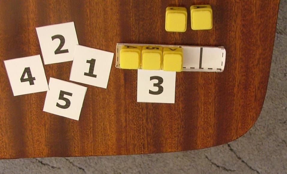 Для этого нужно взять десять кубиков с размером ребра 1,5-2 см, стоящих в коробке. Подойдут и детали конструктора Лего. Если нет подходящих предметов, то можно распечатать другие пособия.