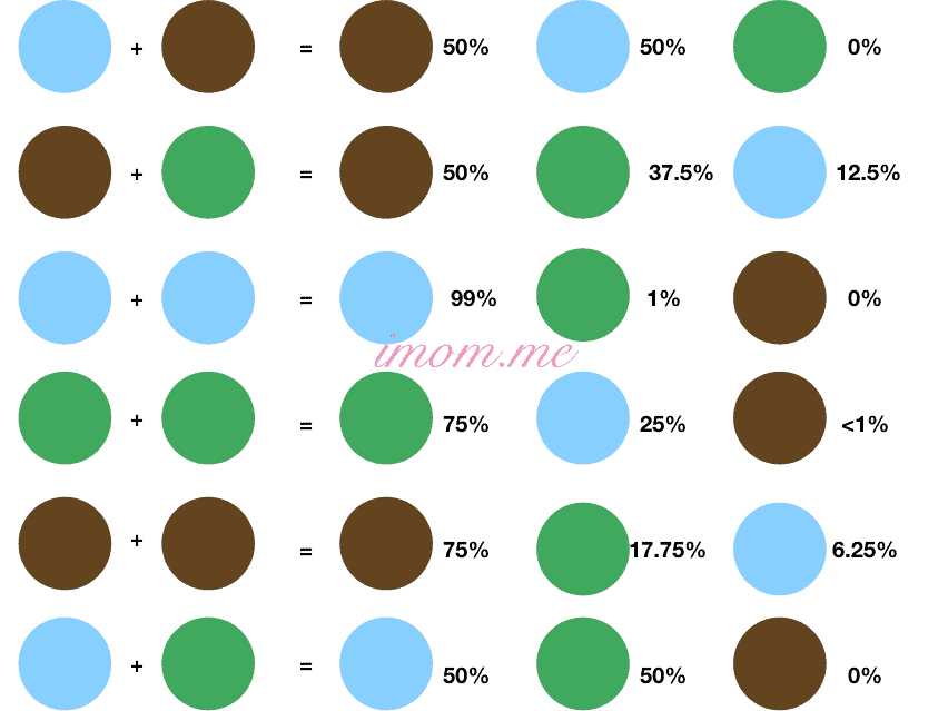Зеленый – зеленый: 75% зеленоглазый, 24% голубоглазый и всего 1% кареглазый. Голубой – зеленый: 50% зеленоглазый, 50% голубоглазый. Карий – зеленый: 50% кареглазый, 37% зеленоглазый, 13% голубоглазый. Карий – голубой: 50% кареглазый, 50% голубоглазый.