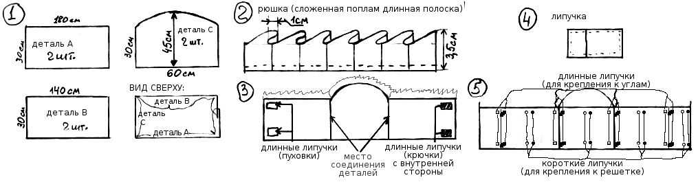 - Из ткани одной расцветки 4 полоски 60*10. И две полоски ткани размером 11*120см.