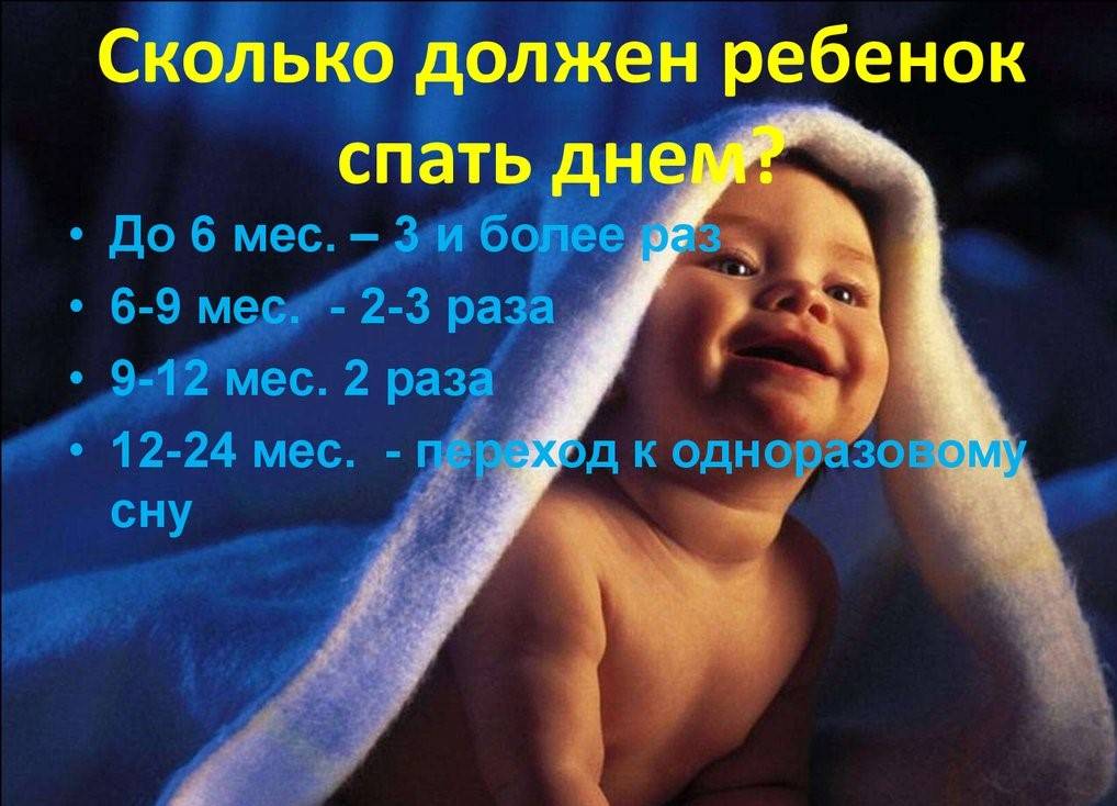 В среднем общая продолжительность сна у младенца, которому исполнилось 9 месяцев, составляет 14-15 часов. Ночной период занимает 10 часов, оставшиеся 4-5 часа делятся на дневные интервалы сна. Обычно это время с 9.00 до 11.00 и с 14.00 до 16.30. Так выглядит идеальная ситуация.