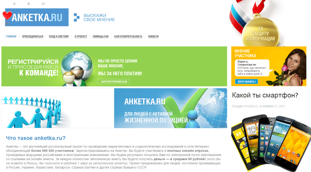 Больше всего меня устраивает сайт Анкетка. Во-первых, платят даже за короткие версии опросов, во-вторых, возможно получение вознаграждения наличными (от 1000 рублей). Я заполняю данные не только от себя, но и от мужа, зарегистрировавшись под вторым аккаунтом. Раз в 4-5 месяцев стабильно получаю 2 тысячи на руки. Вознаграждения с других сайтов перевожу на телефон.